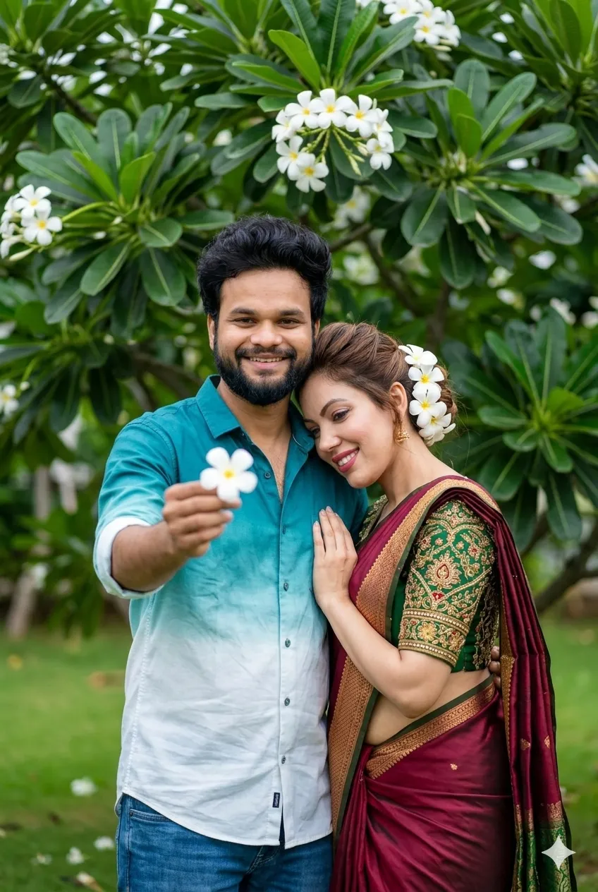 This beautiful AI generated image features a romantic South Asian couple standing in a lush garden filled with blooming frangipani flowers. The man is ...