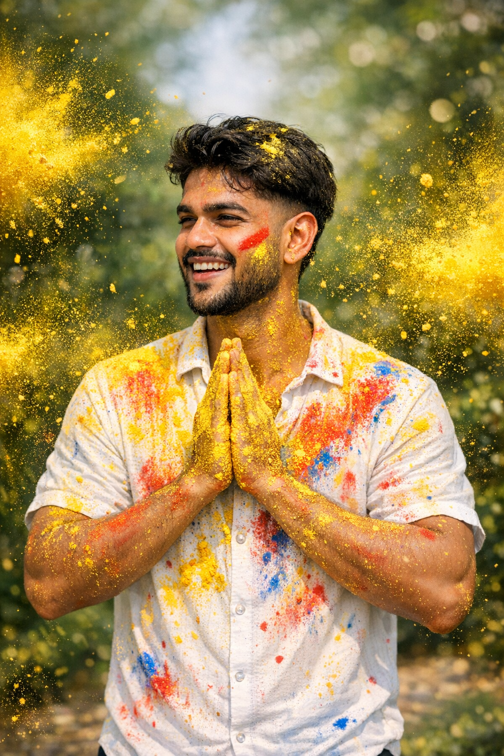 Celebrate the joy of Holi with this ultra-realistic AI-generated festival portrait! π This vibrant image showcases a joyful young man with hands folded in ...