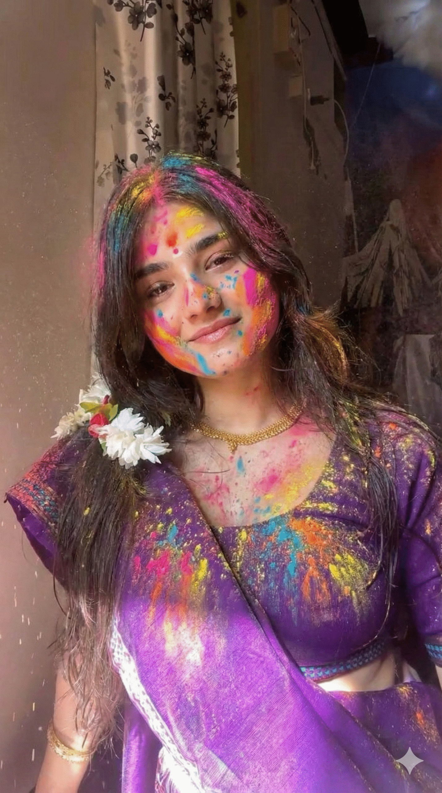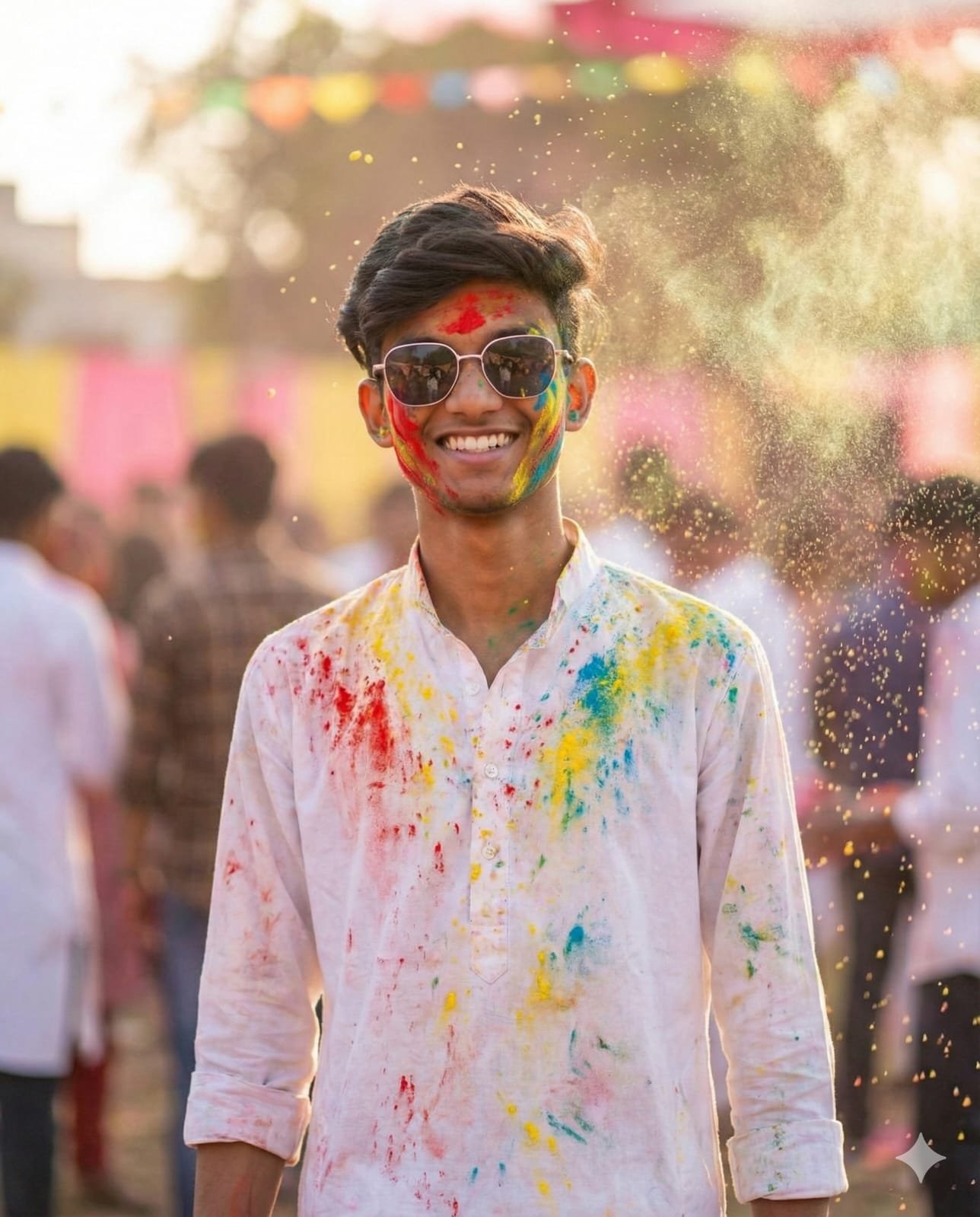 Add realistic and vibrant Holi festival color splashes to the existing photo while keeping the original face, pose, background, lighting, camera angle, and composition ...